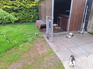 Wir bieten den Welpen in dieser Phase die Möglichkeiten, aktiver zu werden. Die Welpen bestimmen jedoch selbst, wann sie das Welpenhaus verlassen möchten. So wird eine Überforderung vermieden! Von Tag zu Tag tasten die Welpen sich immer weiter vor, bis sie letztendlich den Rasen betreten. Weil die Welpen nun ständig die Möglichkeit haben, das Welpenhaus zu verlassen, wird so schon früh die Grundlage für die spätere Stubenreinheit gelegt. Ab der 5./6. Woche lösen sich alle Welpen ausschließlich auf dem Rasen, das Welpenhaus und der Bereich davor bleiben sauber.